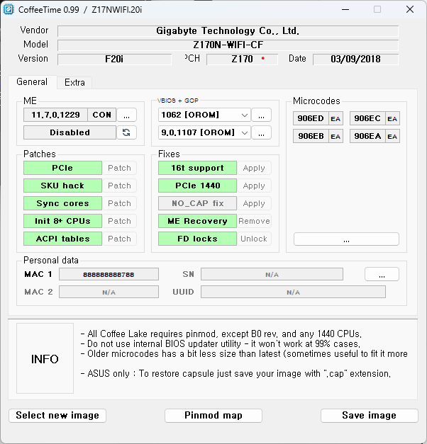 CoffeeTime 0.99 — Download — ----- Mirror ----- - Added 16-threaded CPUs support for any s1151 22nm boards (method provided by @dsanke ). - Added fix to remove “ME abnormal” warning on MSI boards with disabled ME. (also by @dsanke ) - Added fix for