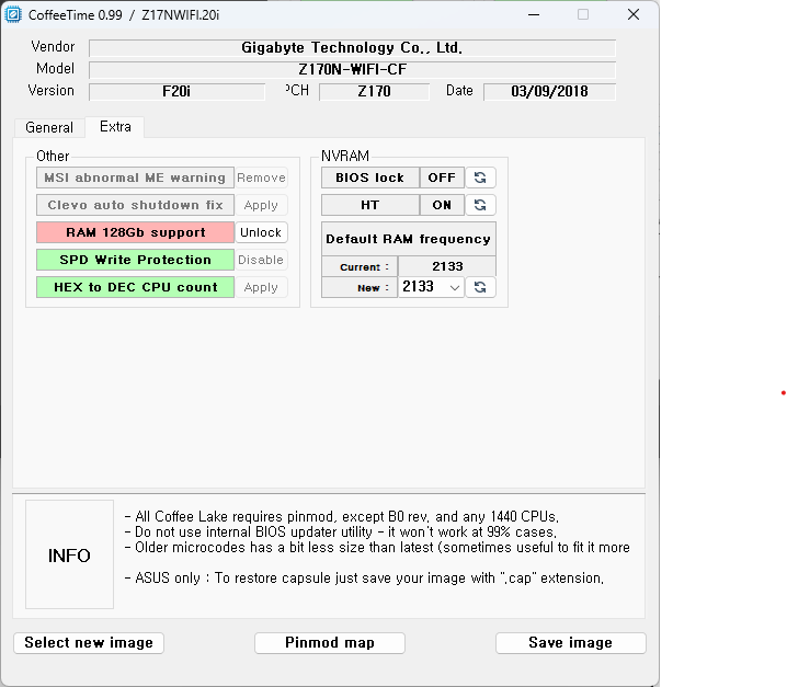 CoffeeTime 0.99 — Download — ----- Mirror ----- - Added 16-threaded CPUs support for any s1151 22nm boards (method provided by @dsanke ). - Added fix to remove “ME abnormal” warning on MSI boards with disabled ME. (also by @dsanke ) - Added fix for